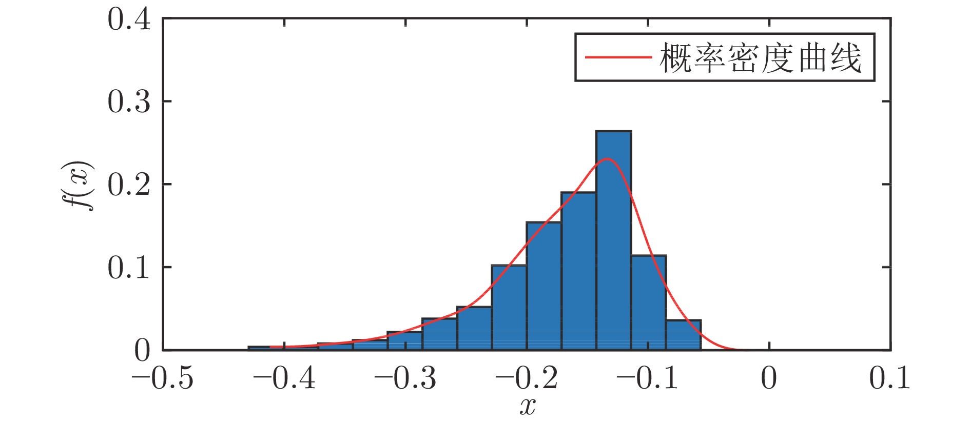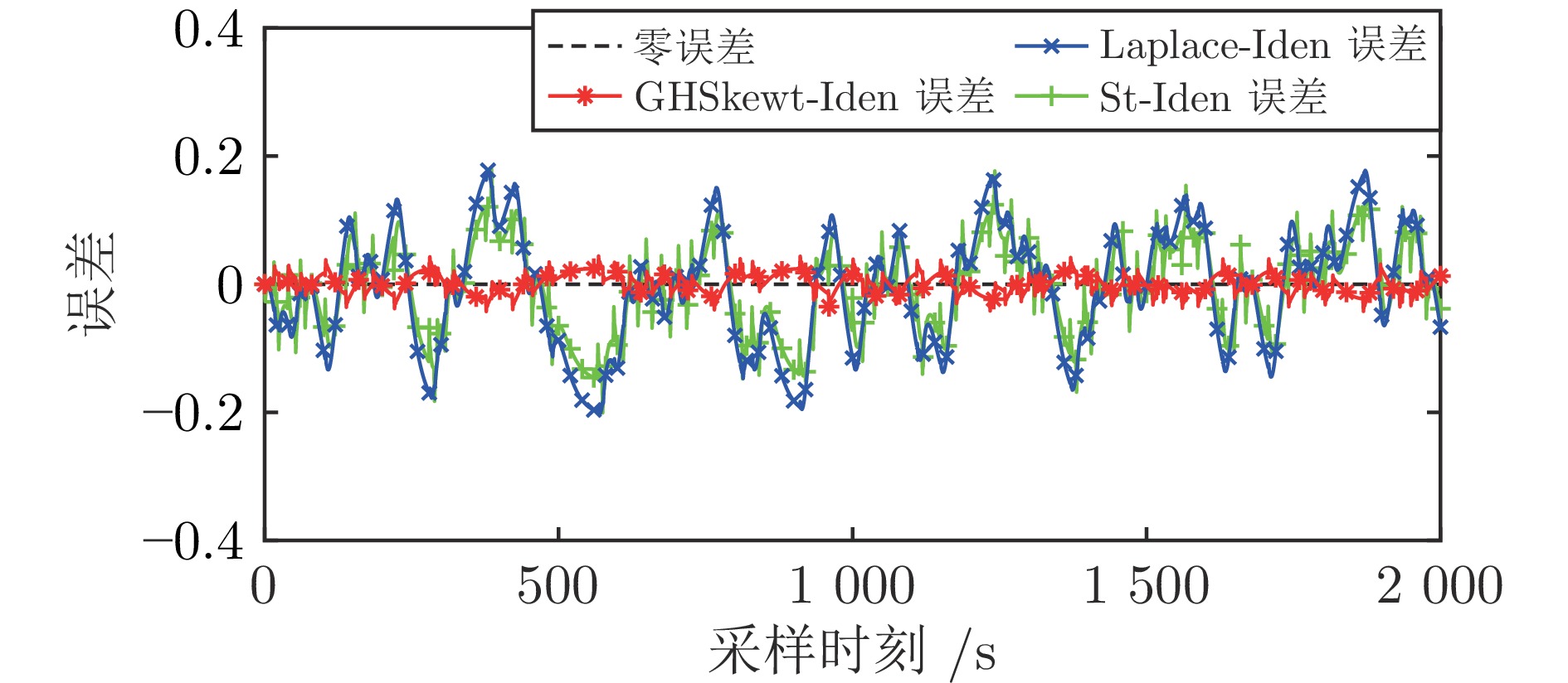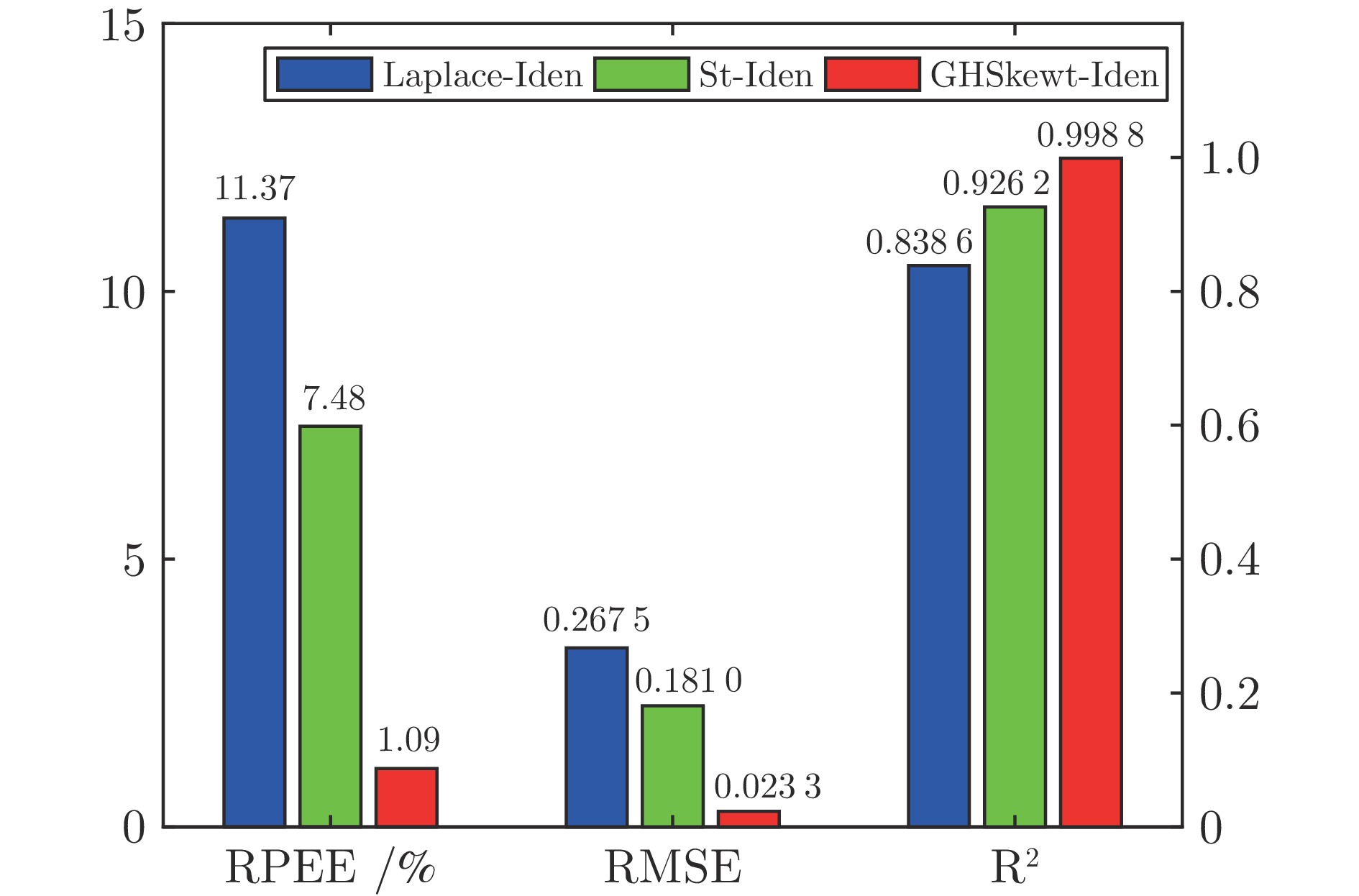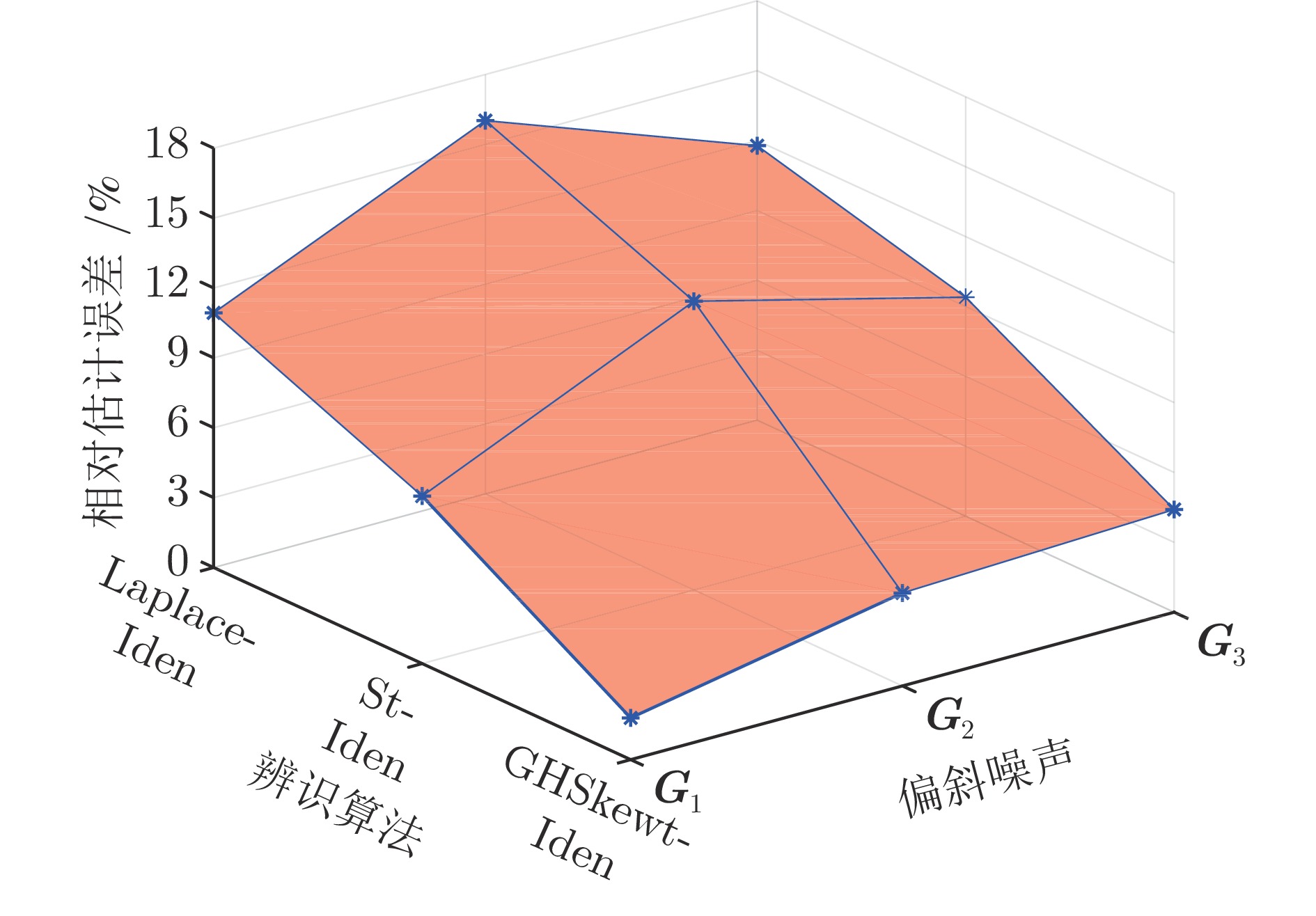 异常值比例 Laplace-Iden St-Iden GHSkewt-Iden RPEE (%) RMSE $ {\rm{R}}^2 $ RPEE (%) RMSE $ {\rm{R}}^2 $ RPEE (%) RMSE $ {\rm{R}}^2 $ 5% 0.71 0.0144 0.9995 0.61 0.0104 0.9998 0.39 0.0072 0.9999 10% 2.44 0.0475 0.9949 1.20 0.0186 0.9992 1.13 0.0192 0.9992 15% 3.20 0.0564 0.9928 1.40 0.0267 0.9984 1.42 0.0271 0.9983 20% 5.33 0.0880 0.9826 2.70 0.0499 0.9944 2.74 0.0503 0.9943 表 3 不同偏斜噪声下蒙特卡洛仿真的平均RPEE、RMSE和$ {\rm{R}}^2 $
