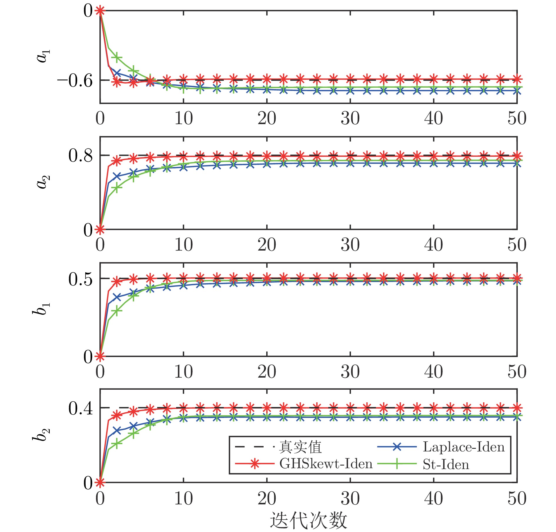 偏斜噪声 Laplace-Iden St-Iden GHSkewt-Iden RPEE (%) RMSE $ {\rm{R}}^2 $ RPEE (%) RMSE $ {\rm{R}}^2 $ RPEE (%) RMSE $ {\rm{R}}^2 $ $ {\boldsymbol{G}}_1 $ 10.93 0.2615 0.8416 7.19 0.1889 0.9175 1.79 0.0315 0.9978 $ {\boldsymbol{G}}_2 $ 16.02 0.3381 0.7356 12.39 0.2825 0.8155 3.99 0.0699 0.9884 $ {\boldsymbol{G}}_3 $ 11.78 0.2607 0.8426 9.40 0.2184 0.8886 4.41 0.0779 0.9855 表 4 参数初始值不同时蒙特卡洛仿真的均值和标准差