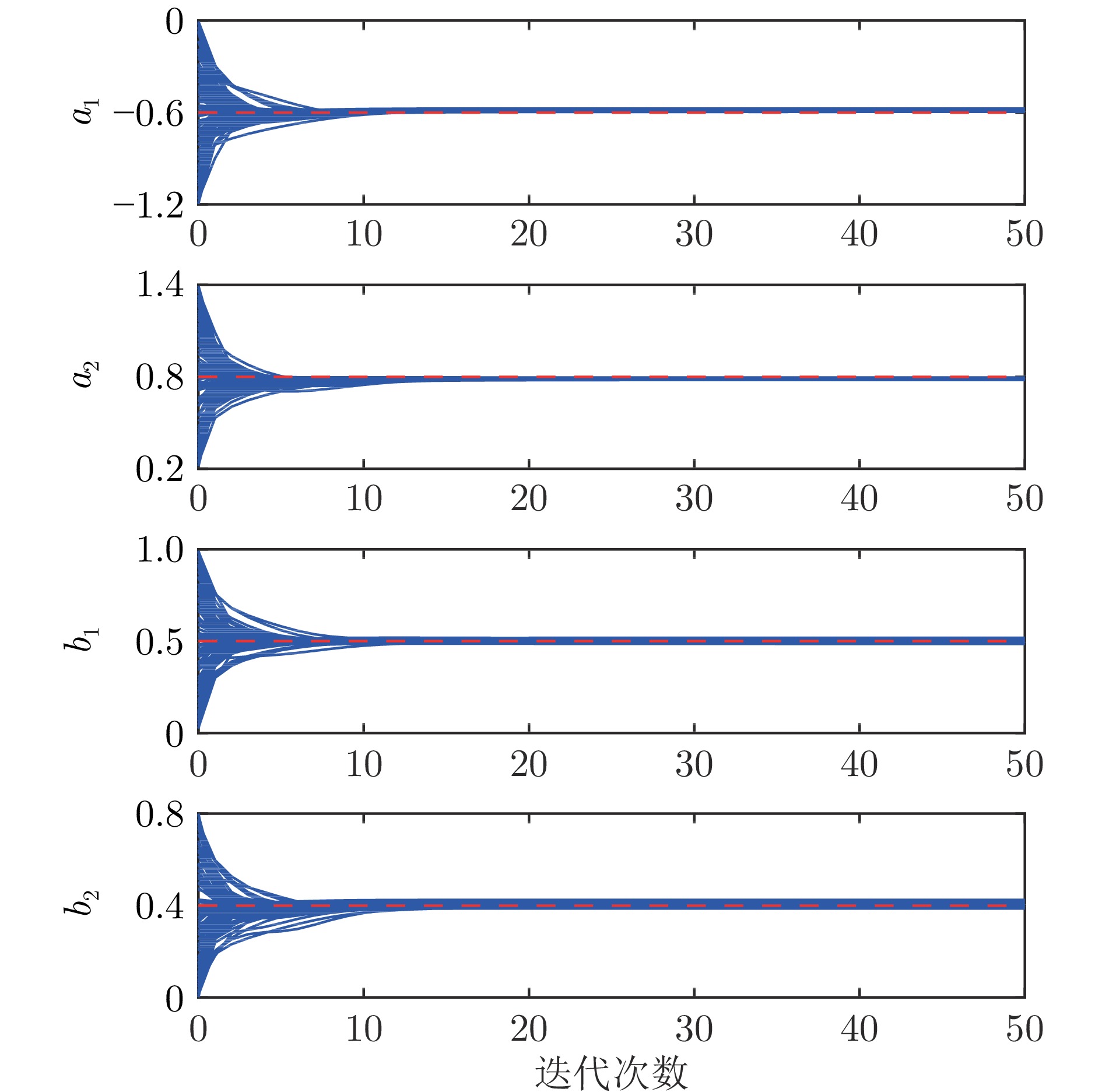模型参数 真实值 均值 标准差 $ {{a_1}} $ − 0.6000 − 0.5860 0.0045 $ {{a_2}} $ 0.8000 0.7872 0.0033 $ {{b_1}} $ 0.5000 0.5028 0.0068 $ {{b_2}} $ 0.4000 0.4037 0.0080 表 5 自我验证的RMSE和$ {\rm{R}}^2 $